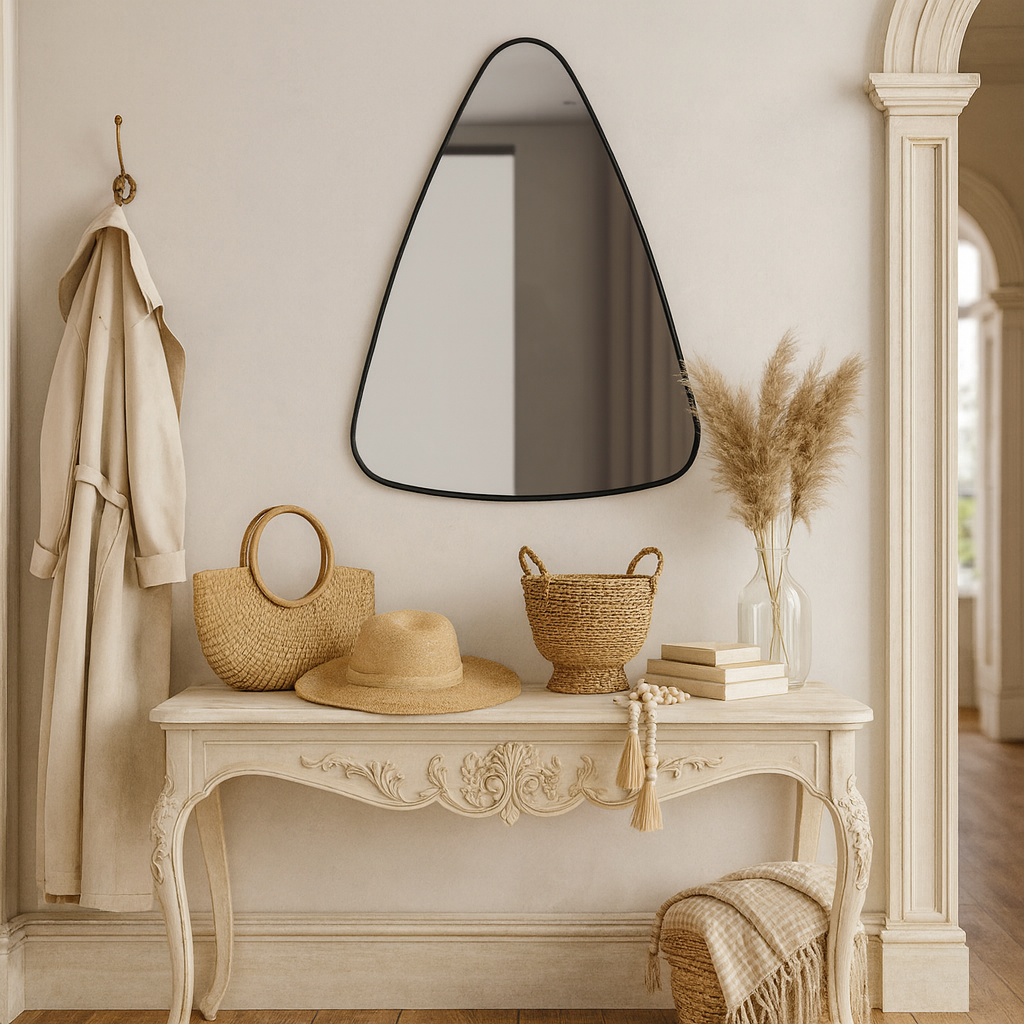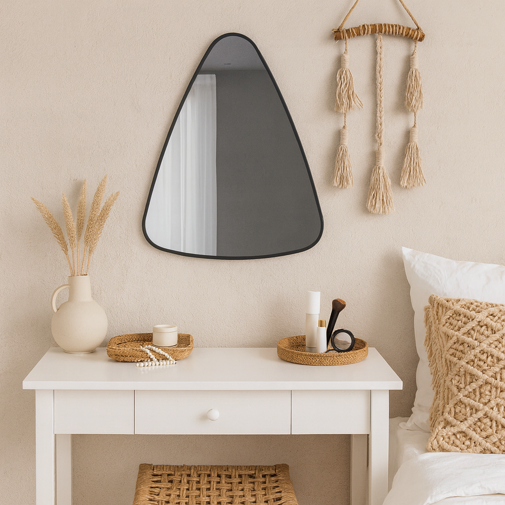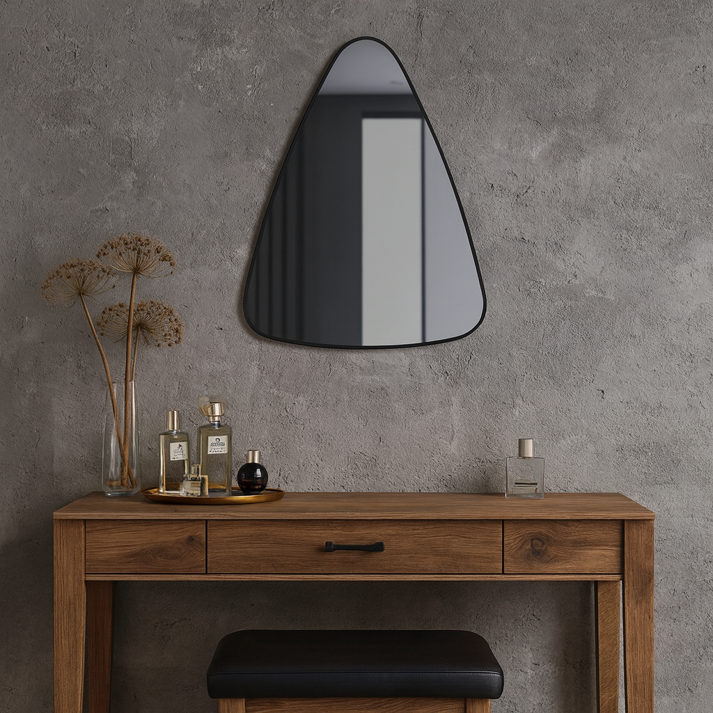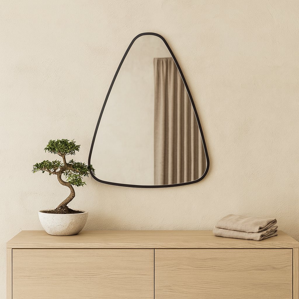Bu modern asimetrik duvar aynası, yumuşak üçgen formu ve mat siyah MDF çerçevesi ile evinize sanatsal, minimalist ve şık bir dokunuş katar. Organik tasarımı sayesinde ışığı mükemmel şekilde yansıtır ve banyo, yatak odası, salon veya antre gibi alanlarda dekoratif bir odak noktası oluşturur.