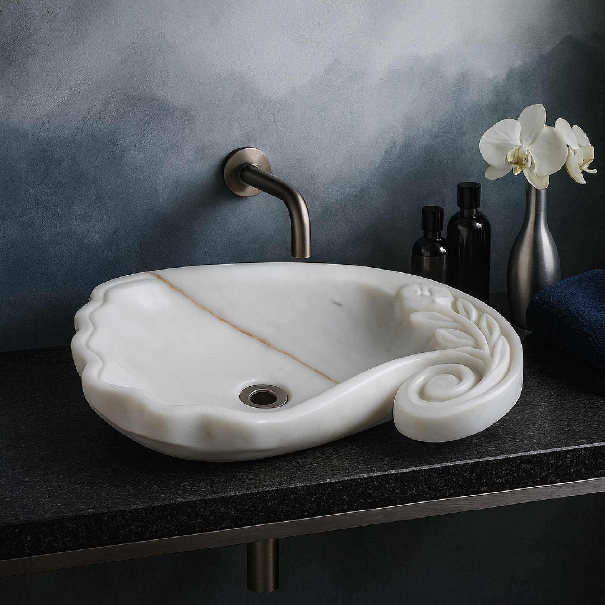 Bu zarif tasarımlı White Marble (Beyaz Mermer) lavabo, el oyma kabartma detayları ve organik kıvrımlı formuyla lüks banyo tasarımlarına sanatsal bir dokunuş katar. Tamamen doğal beyaz mermer bloktan oyularak üretilen bu lavabo, sade beyaz dokusuna eşlik eden hafif damar geçişleriyle hem modern hem klasik banyolarda uyumlu bir estetik sunar.